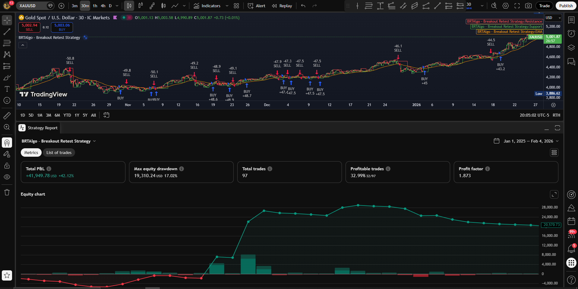 Breakout + retest entry logic with optional volume confirmation and adaptive stops. Designed for clean backtests and consistent alerts.