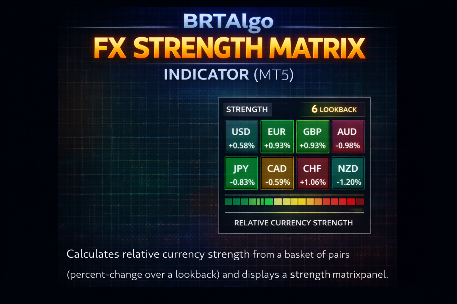 Calculates relative currency strength from a basket of pairs (percent-change over a lookback) and displays a strength matrix/panel.