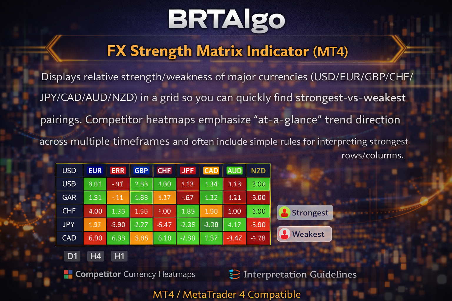 Displays relative strength/weakness of major currencies (USD/EUR/GBP/CHF/JPY/CAD/AUD/NZD) in a grid so you can quickly find strongest-vs-weakest pairings. Competitor heatmaps emphasize �at-a-glance� trend direction across multiple timeframes and often include simple rules for interpreting strongest rows/columns.