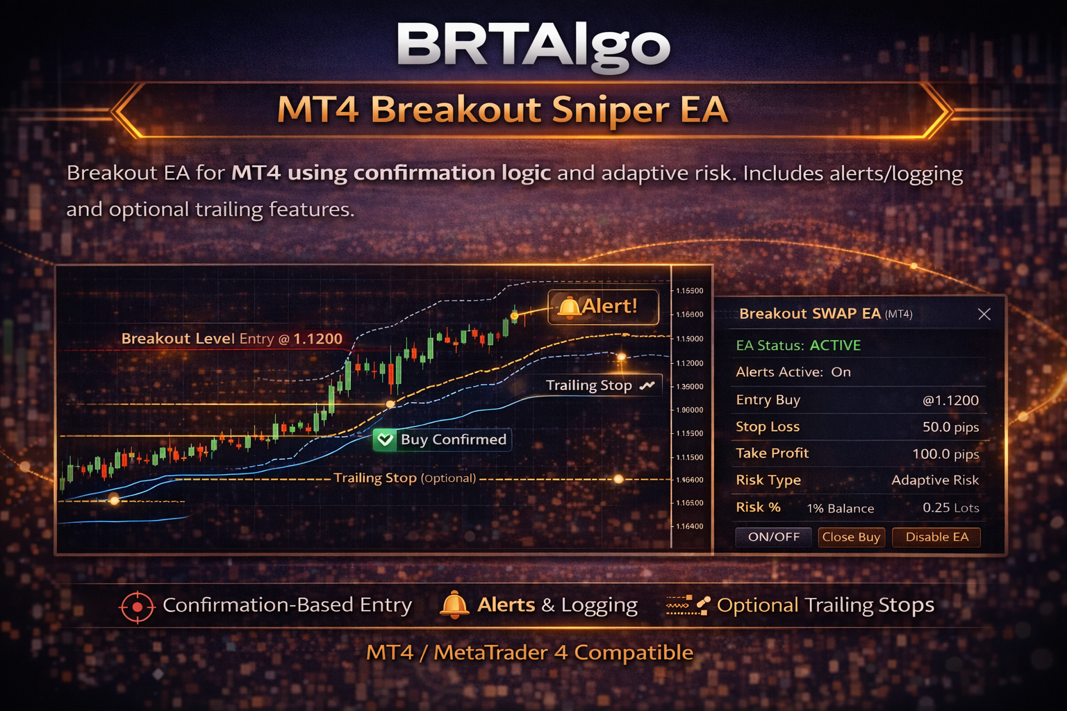 Breakout EA for MT4 using confirmation logic and adaptive risk. Includes alerts/logging and optional trailing features.