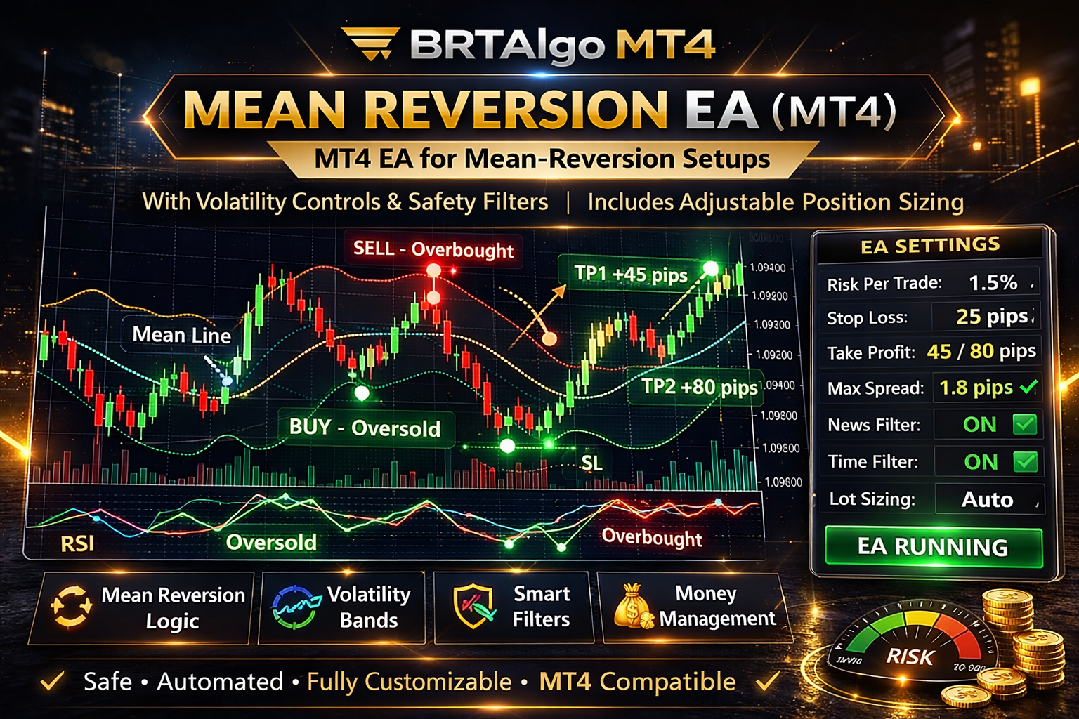 MT4 EA for mean-reversion setups with volatility controls and safety filters (max spread, news/time filters). Includes adjustable position sizing.