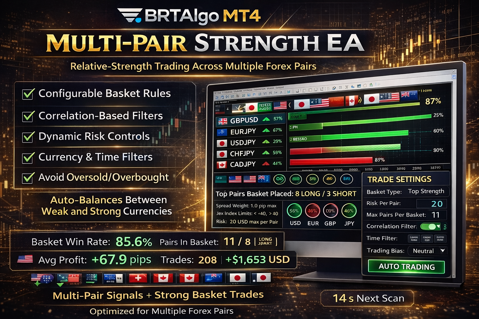 Trades based on relative-strength signals across multiple pairs with configurable basket rules. Includes risk caps, correlation controls, and filters.