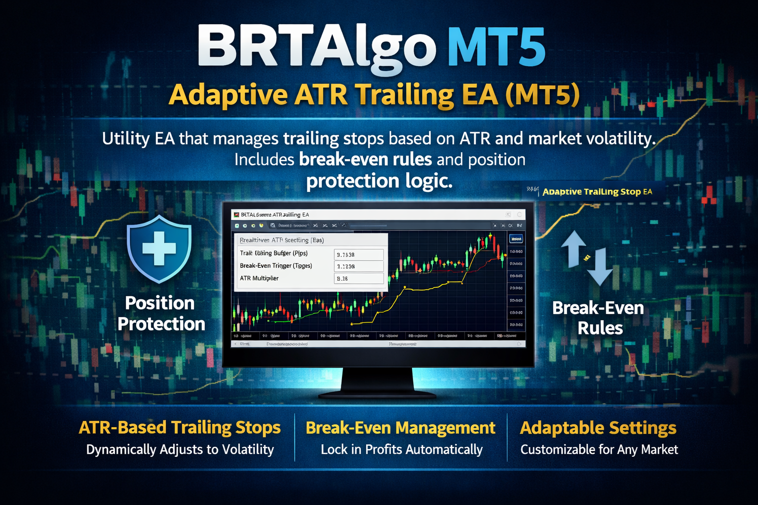 Utility EA that manages trailing stops based on ATR and market volatility. Includes break-even rules and position protection logic.